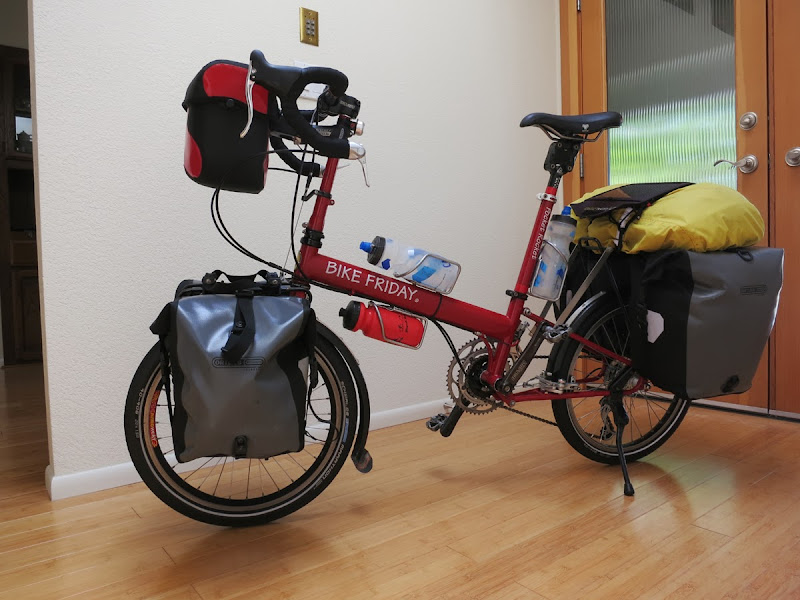 Getting ready for my big trip this summer which will be a self-contained bike tour in Europe carrying a 45-50 pound load. I'll fly to Birmingham, England and stay with friends in Market Harborough about 40 miles away. We plan to shuttle our bikes south to Portsmouth on the English Channel and catch an overnight ferry to St. Malo in northern France. From there, we'll ride our bikes south to the Loire Valley region, then travel east along the Eurovelo 6 Route, an establish bike path which meanders east from western France to the Black Sea following three of Europe's largest rivers, the Loire, Rhine and Danube Rivers. Our ending point is Passau in southern Germany, a distance of around 1,000 miles. There will be 9 riders, 4 from the U.S. and 5 from the U.K. The last time I rode with members of this group was during our 2010 End-to End Bike Tour in the U.K. Many thanks to our U.K. friends for organizing this tour. I'm definitely looking forward to our adventure. Don't know if I'll post any pictures along the way since I don't know what type of phone data service I'll get, but see how it goes. Pictured below is my Bike Friday set up for the tour before everything is disassembled for packing. Since we will be camping a lot, I decided to try using a Goalzero solar charger to keep my electronics running. I attached a Nomad 7 solar charger to the top of my rear panniers and will be charging a Guide 10 Plus Power Pack during the day. In the evening, I'll use the power pack to charge up my smartphone. This will be a good test for the product. Cheers.